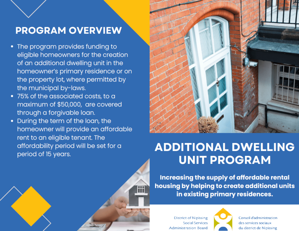 The District of Nipissing Social Services Administration Board seeks to increase the supply of affordable rental housing by helping to create additional units in existing primary residences with their Additional Dwelling Unit Program.