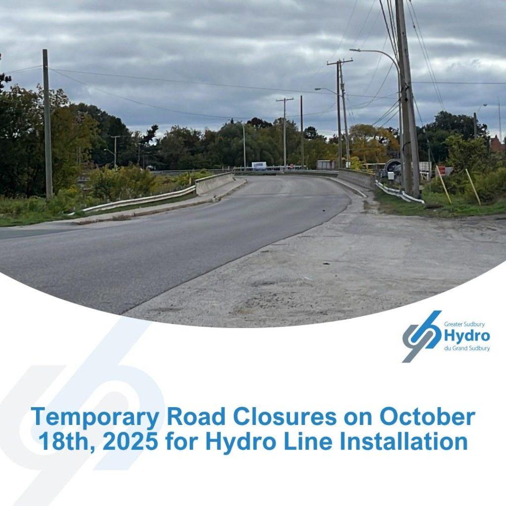 Please be advised that the bridge on Cache Bay Rd/John Street will be closed to traffic on Saturday, October 18, 2025, from 7 a.m. to 4 p.m. to allow Greater Sudbury Utilities to safely install new hydro lines.